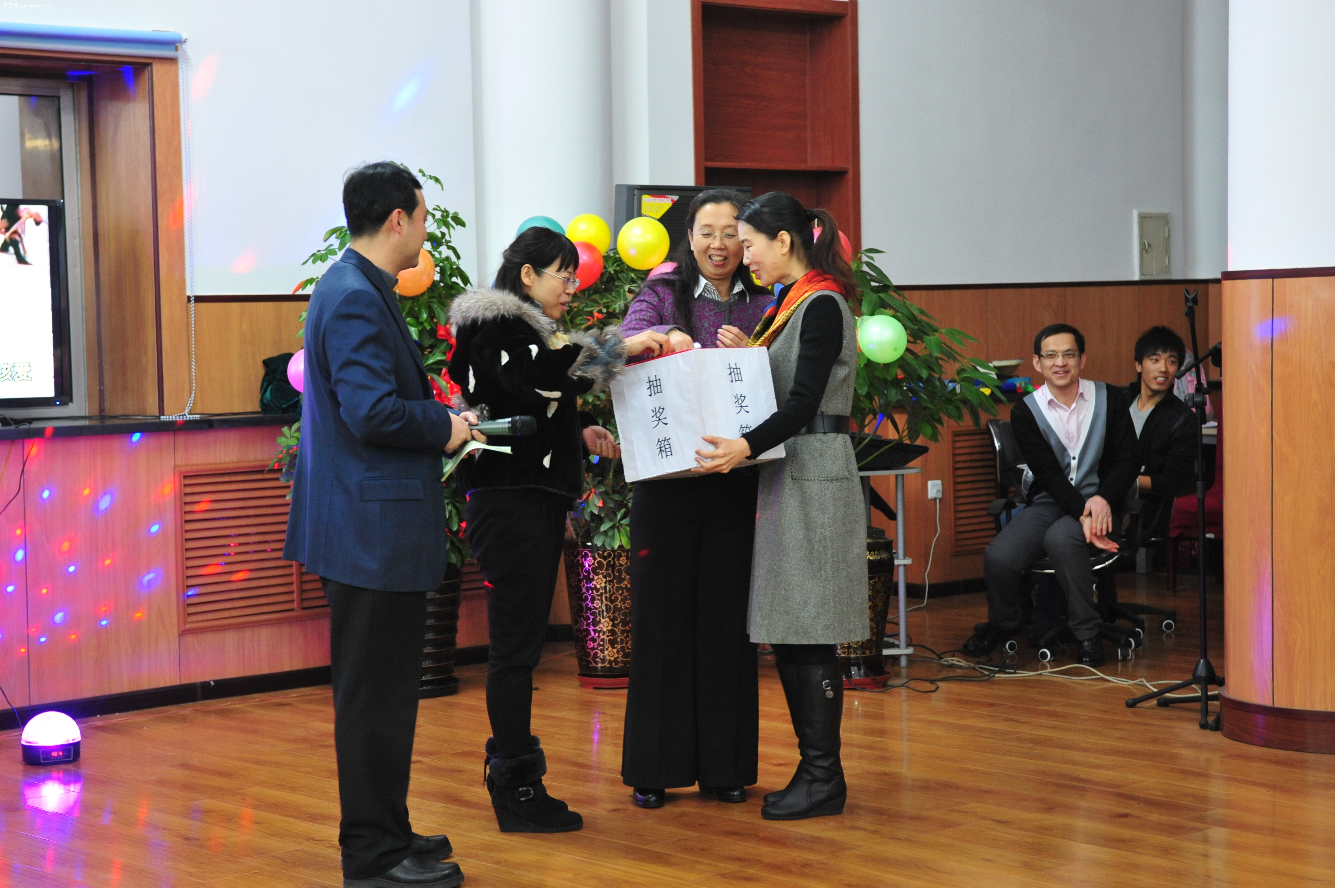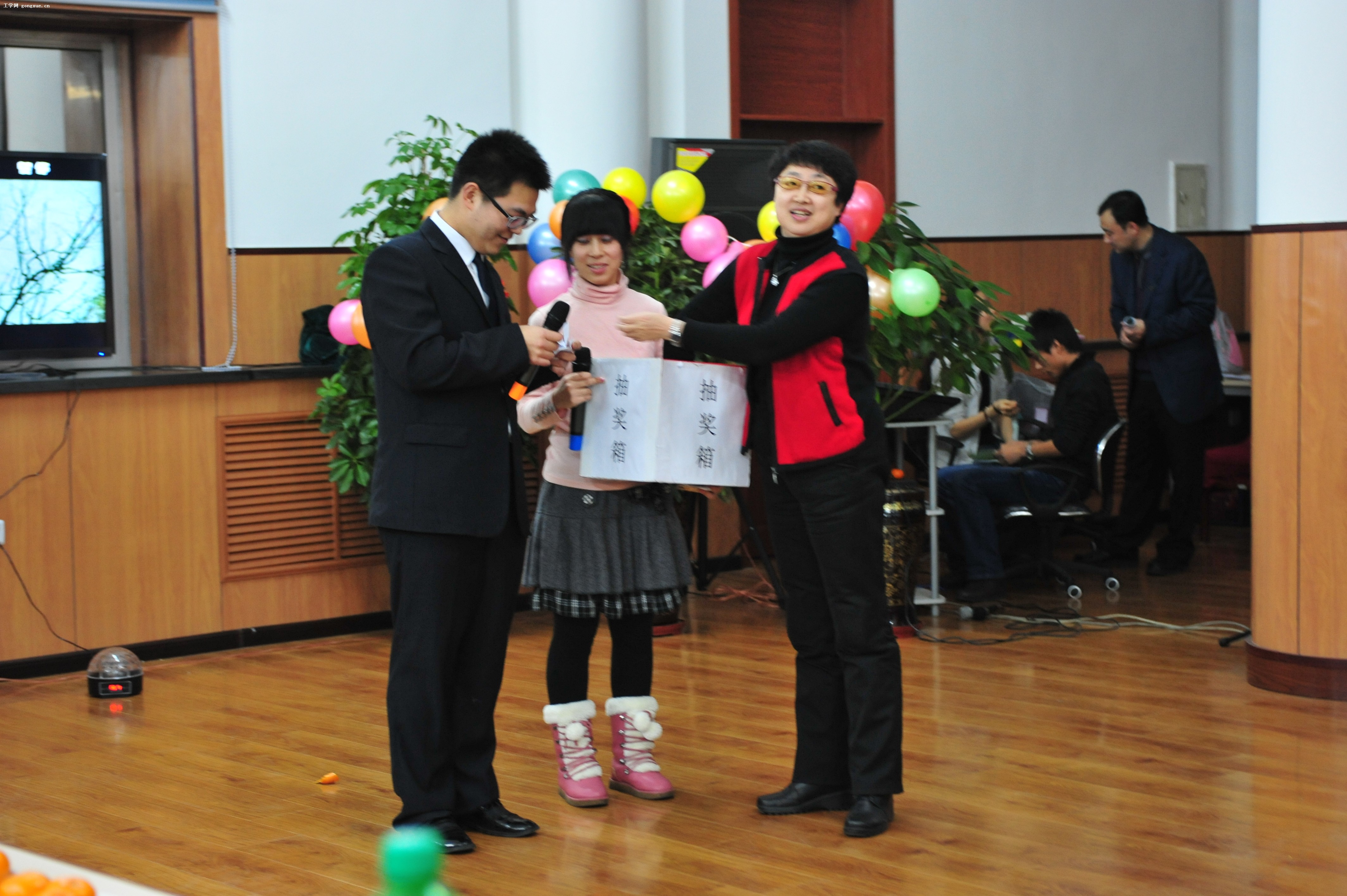 马原教研室自创的三句半既幽默风趣,又展示了思政部2012年的新风貌、新气象、新成绩,受到全场观众的热捧。2012级硕士生辛丽雯、杨未等同学的华尔兹表演华丽登场,舞姿精妙,赢得阵阵掌声。联欢会期间穿插的抽奖和游戏项目更是把联欢会一次次推向高潮。联欢会在师生大合唱《明天会更好》中落幕。