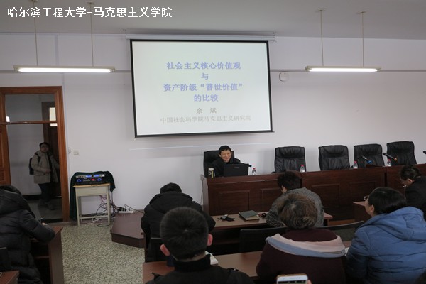 余斌老师的讲座分为两大部分,第一部分讲的是“社会主义核心价值观与资产阶级‘普世价值’的比较”。余斌老师从社会主义核心价值观的富强、民主、文明、和谐, 自由、平等、公正、法治, 爱国、敬业、诚信、友善二十四个字展开,并在马克思恩格斯经典原著中找到相关理论依据。富强、民主、文明、和谐是国家层面的价值目标,自由、平等、公正、法治是社会层面的价值取向,爱国、敬业、诚信、友善是公民个人层面的价值准则。他讲到,事实上,社会主义核心价值观与资产阶级“普世价值”就存在着最彻底的决裂。只不过,由于资产阶级“普世价值”伪善地使用了人类思想史上的美好名词,这两者才在一些词汇上存在着表面上的重合。这种重合,的确会被一些人拿来混淆视听,尽管如此,我们并不应当把这些词汇“让”给资产阶级的意识形态家们,而应当彻底揭露资产阶级“普世价值”的虚伪,高扬社会主义核心价值观。