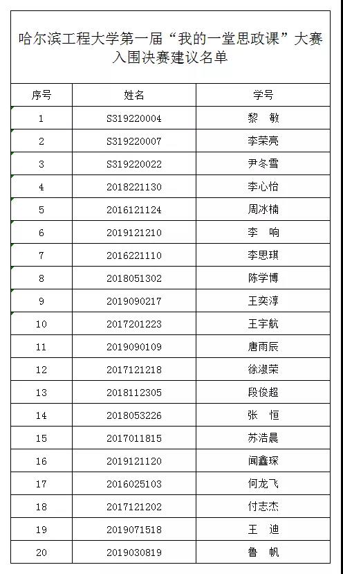 截止2019年11月15日,beat365英国官方网站第一届“我的一堂思政课”大赛共有70名同学报名参加,其中50名同学的作品成功进入大赛初赛。经大赛评审委员会对参赛作品评审后,共有20位同学成功入围决赛。现将入围决赛建议名单公布如下(按评分成绩由高到低排序):