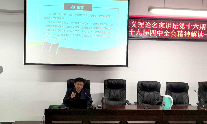 项久雨教授将“制度”和“智慧”为关键词,从历史的角度引出《中共中央关于坚持和完善中国特色社会主义制度、推进国家治理体系和治理能力现代化若干重大问题的决定》(以下简称《决定》)的出台背景,以“三个板块”对《决定》的结构内容进行归纳阐述,指出了《决定》的创新性、战略性、系统性、实践性和科学性等五大特征,提炼了《决定》的十大亮点。最后,项教授系统阐发了《决定》的重大历史意义、理论意义、实践意义和世界意义。指出《决定》全面总结了我国国家制度和国家治理体系的显著优势、战略任务和现实路径,是马克思主义中国化的最新成果,彰显了中国制度的优越性,为实现中华民族伟大复兴提供了有力保障,为全球治理提供了中国智慧和中国方案,具有重大意义。