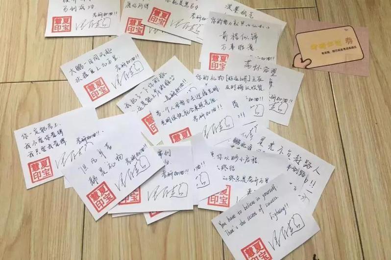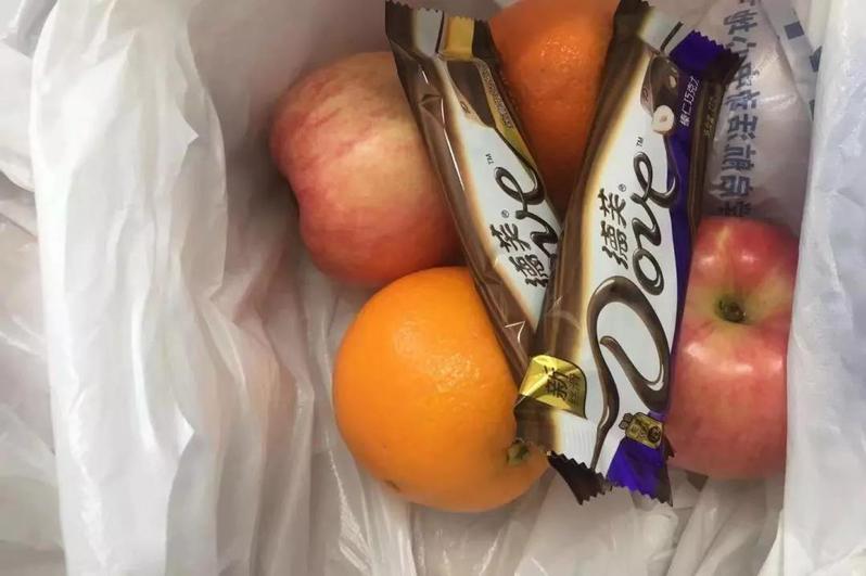 福袋里是两个橙子,两个苹果,两个德芙巧克力,寓意心想事成,平安顺利,得到福气。而和福袋相得益彰的是书记和导员的亲笔祝福卡,还有那最重要的“考研必过券”。