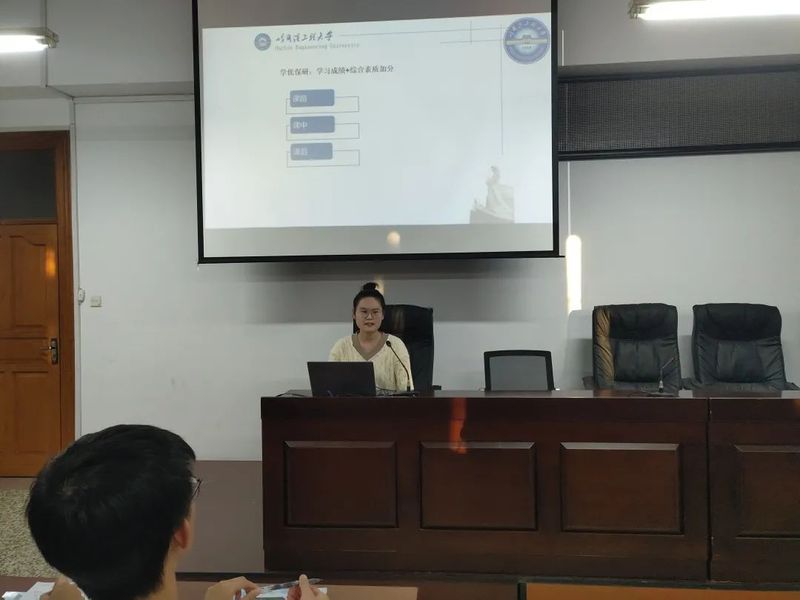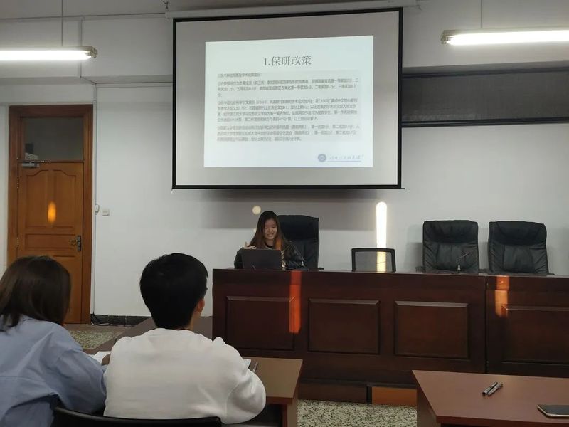 首先,刘贵占副院长为同学们讲解2020级最新保研政策,分为学优保研、全面发展保研两部分。其次,由获支教保研资格的房星含为大家讲解支教保研的相关经验、福利政策以及准备工作。随后,获得学优推免资格的韩姊希、赵冀叶、杨亚婷、杨旭静四位同学分别从学优推免经验、参加国创经验、大学学习经验、文体项目加分等方面做了经验分享。最后,穆泳含详细解读了2+3保研政策,而郭成远以“打牢理论基础,把握核心竞争力”主题进行相关分享。