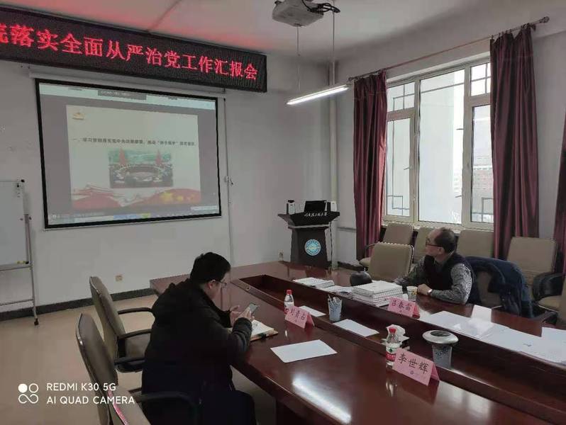 11月25日下午,beat365英国官方网站党委召开落实全面从严治党工作汇报会。会议由党委书记刘振宇同志主持,学校检查组组长吕春雷同志到会指导,学院纪检委员刘贵占同志参加会议。