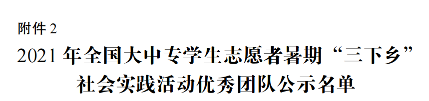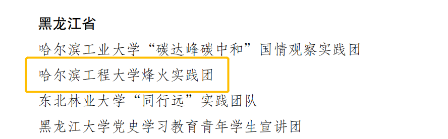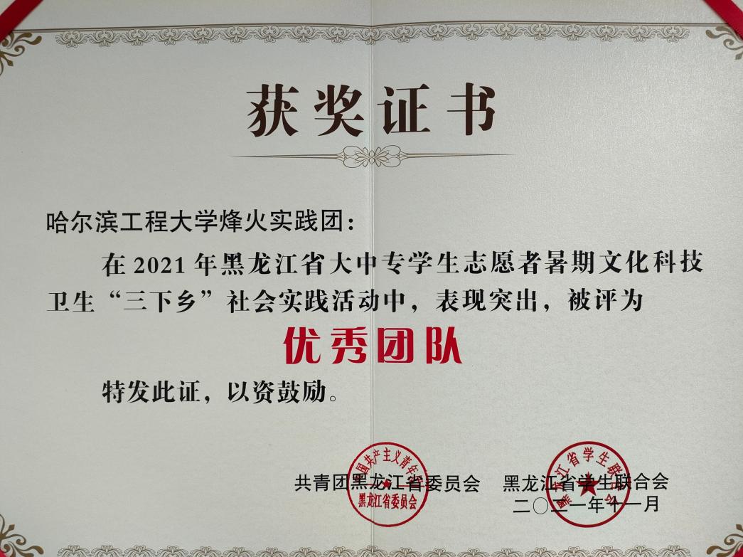 2021年度黑龙江省大中专学生志愿者暑期文化科技卫生“三下乡”社会实践活动优秀成果揭晓,我校共青团beat365英国官方网站委员会的“烽火实践团”作为参赛团队在全省4653支社会实践团队共43607名师生中崭露头角,获得省级优秀实践团队荣誉称号,并在全国“三下乡”暑期实践活动评比中获得优秀实践团队荣誉称号(全国共388个获奖团队)。