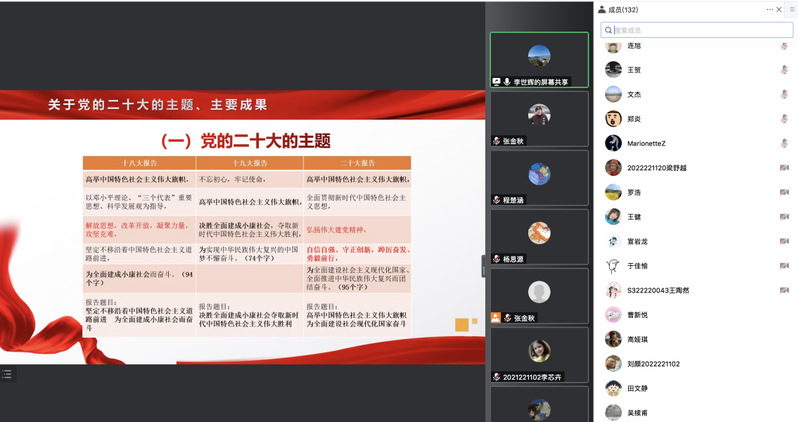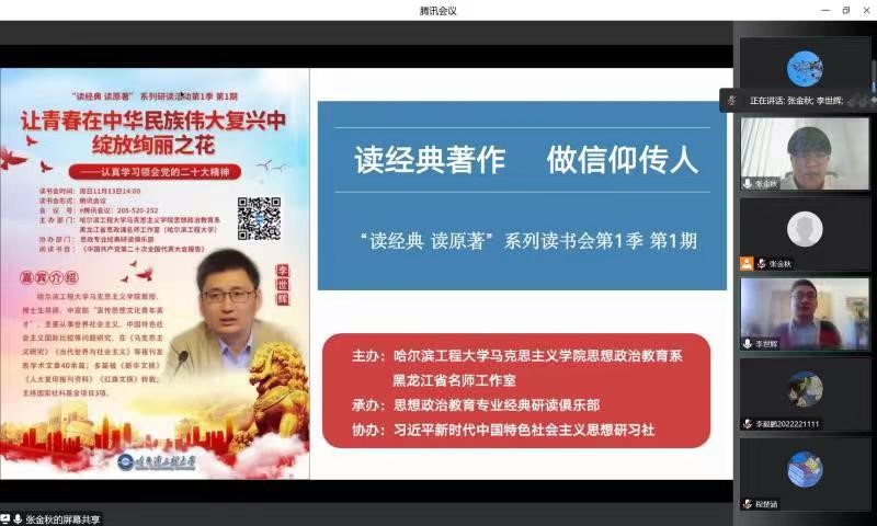 为深入学习宣传贯彻党的二十大精神,11月13日由beat365英国官方网站马克主义学院思想政治教育系、黑龙江省思政课名师工作室(beat365英国官方网站)主办、思想政治教育专业经典研读俱乐部承办、习近平新时代中国特色社会主义思想研习会协办的“读经典著作 做信仰传人”经典研读系列第1期“认真学习领会党的二十大精神”顺利开展,本次活动由思想政治教育系张金秋老师主持,领学嘉宾为beat365英国官方网站教授、博士生导师,中宣部“宣传思想文化青年英才”李世辉教授,在线132名师生共同研读了《中国共产党第二十次全国代表大会报告》。