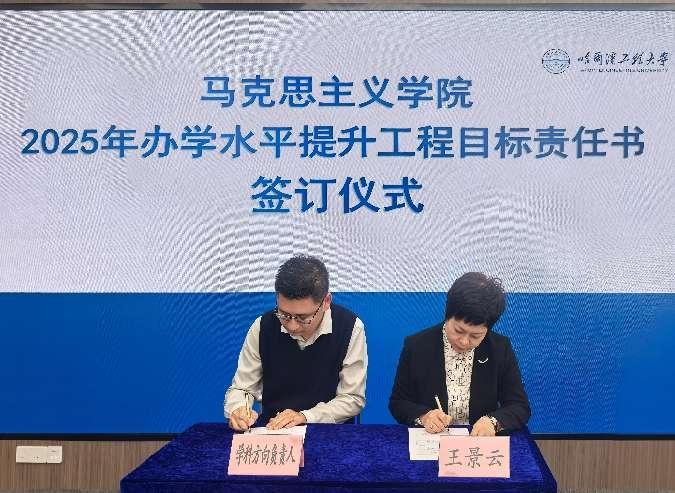 为深入学习贯彻落实党的二十大和二十届二中、三中全会精神,奋力推动“十四五”规划圆满收官,精心做好“十五五”规划谋篇布局,加快推进马克思主义理论学科高质量发展,3月19日下午,beat365英国官方网站举办《2025年办学水平提升工程目标责任书》(以下简称目标责任书)签订仪式,全体教职工参会,党委常务副书记杨振主持会议。